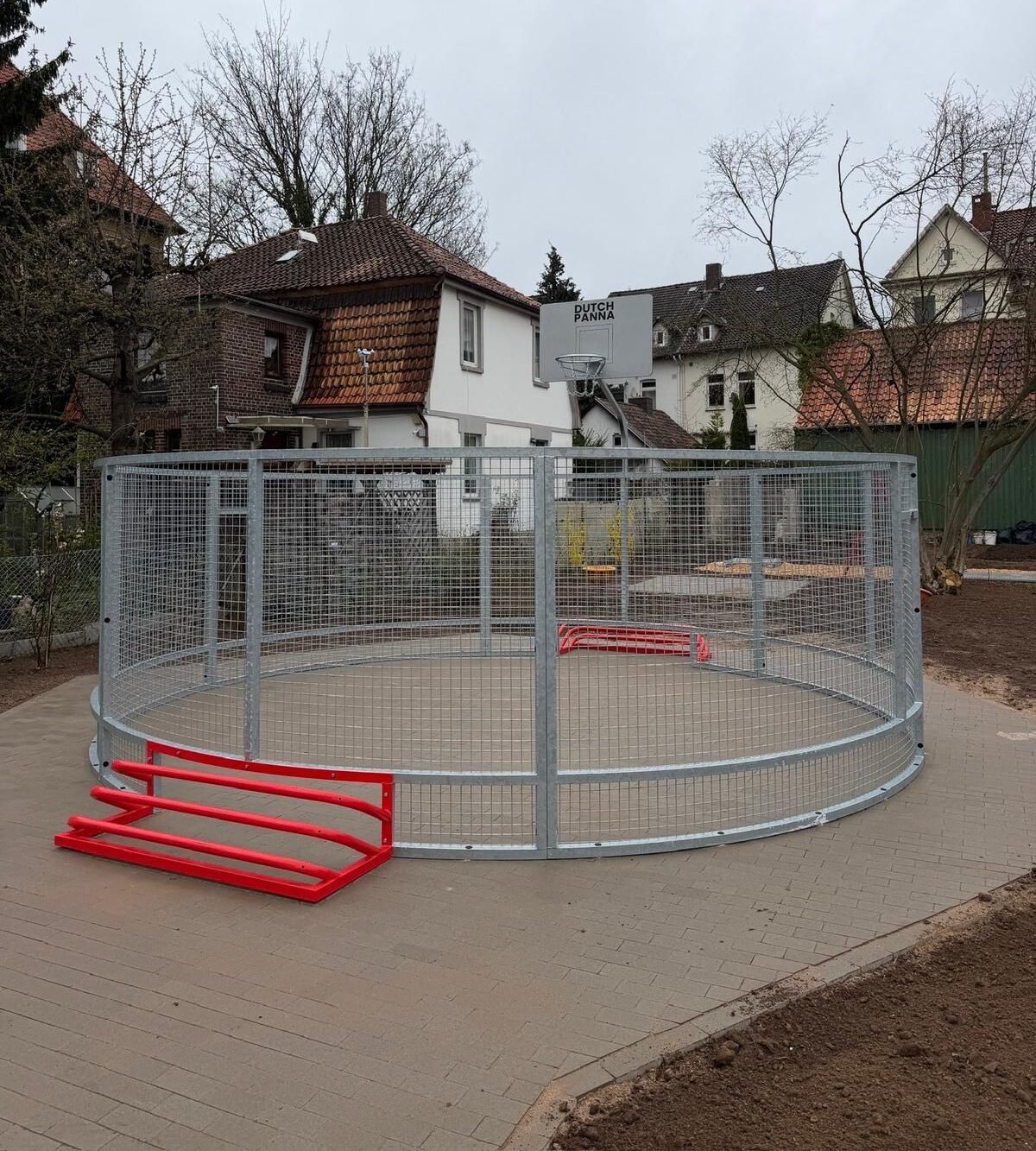 Die Stadt Hameln hat ihre urbane Sportinfrastruktur mit der Installation eines originalen DutchPanna® PK 5000 PRO® mit integriertem Basketballkorb erweitert. Dieser multifunktionale runde Sportkäfig bietet Jugendlichen eine sichere und dynamische Umgebung, um sowohl Fußball als auch Basketball in einem kompakten System zu spielen.