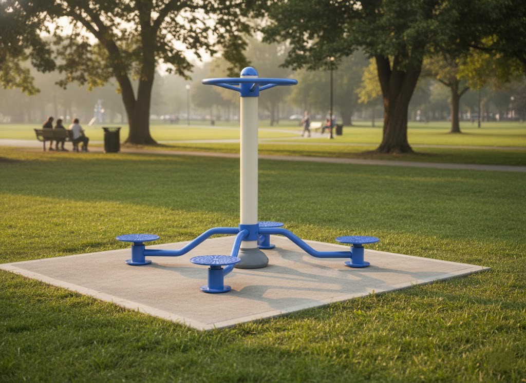 The Body Twister is a durable outdoor fitness unit designed for training core strength, waist mobility, balance, and trunk coordination. The user stands on the rotating platform, holds the central handle for stability, and moves the lower body in a controlled motion from left to right. This rotation effectively activates the oblique abdominal muscles, rectus abdominis, hips, and lower back, and promotes improved spinal mobility, trunk stability, and body awareness.